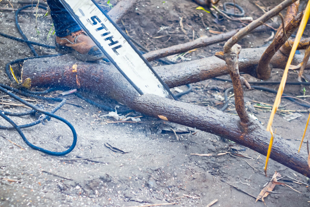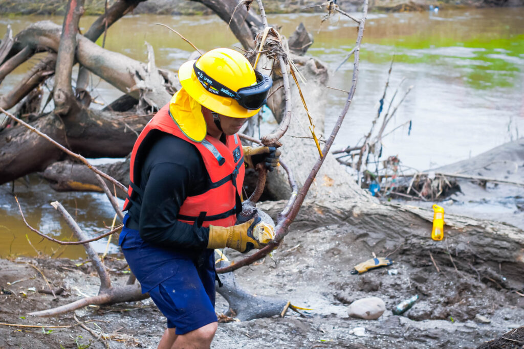 Aprovechando el descenso del nivel del río, se desarrollaron labores de tala controlada y retiro del material vegetal, permitiendo despejar el cauce y restablecer su flujo normal. Estas acciones contribuyen directamente a la prevención de posibles desbordamientos y a la reducción de riesgos para las viviendas y sectores aledaños.