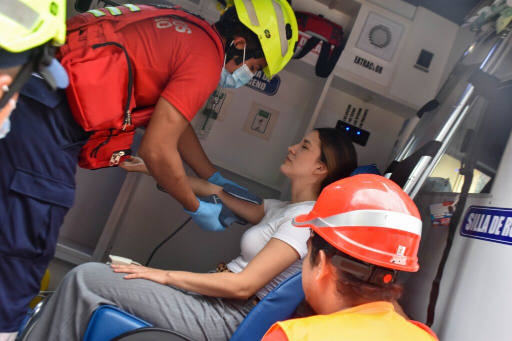 Durante el ejercicio se simuló la atención a una persona que presentó una crisis de ansiedad, lo que permitió al personal aplicar los procedimientos de primeros auxilios y atención prehospitalaria, así como coordinar la llegada oportuna de una ambulancia para su valoración y asistencia.